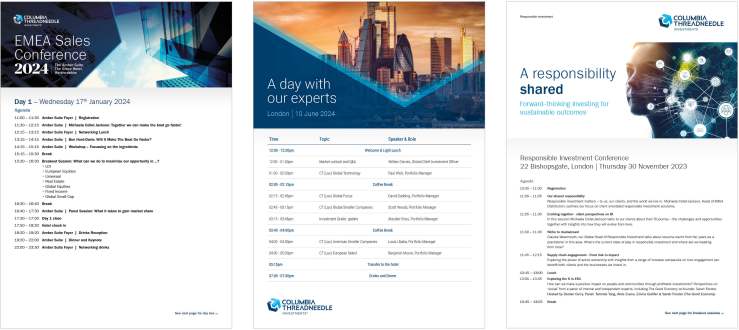 Alongside campaign and publication work, I played a key role in event and conference branding, delivering end-to-end creative for both internal and external events. This covered everything from save-the-date communications and invitations for print and digital, through to delegate packs, name badges, signage, banners and stage sets. In addition, I acted as a brand guardian, helping to maintain and evolve the Columbia Threadneedle brand through the ongoing development and update of brand guidelines. This ensured consistency across all touchpoints while allowing the brand to adapt and grow across different channels, formats and audiences.