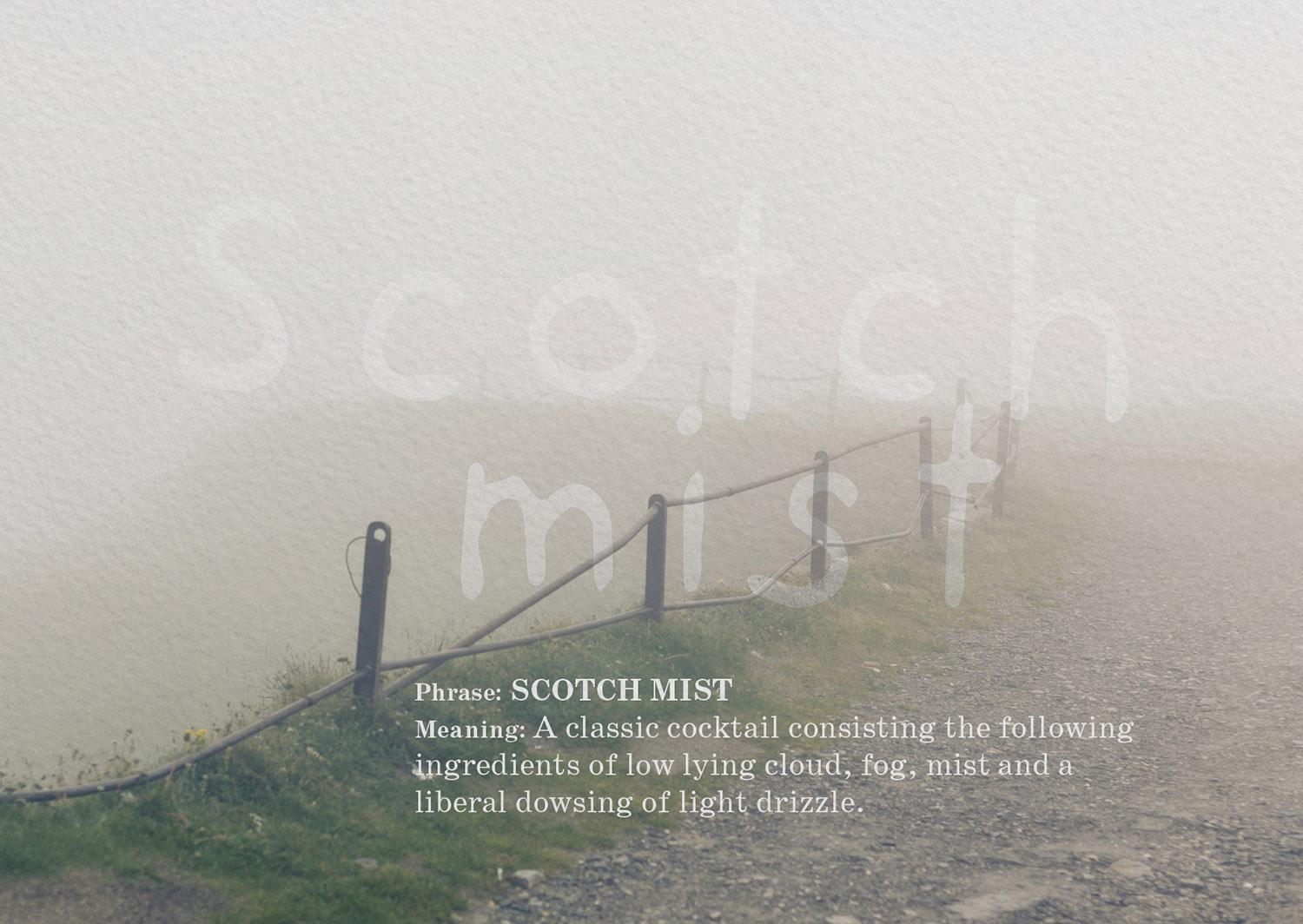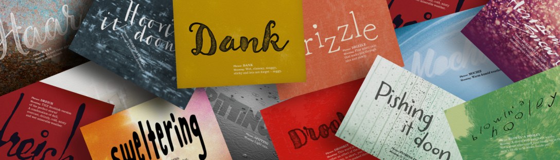 The following images illustrate a curated selection of note cards and the more colourful terms used to describe the incredible, changeable weather in Scotland.